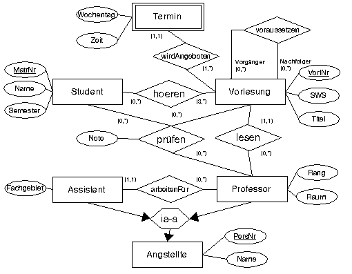 Angenommen, es wurde ein Datenbank-Schema mit Hilfe von ER-Modell entworfen. Dieses Schema enthält 5 Entities. Dabei wird Angestellte zu Assistent und Professor spezialisiert. Bei Termin handelt es sich um ein Weak-Entity. Es ist hier die Modellierung der Aggregation (besser Komposition) von Mengenwertigen Attribut des Objekts Vorlesung. Es gibt auch unterschiedliche Arten der Beziehungen (Relationships). Prüfen ist eine Beziehung der Granularität 3 mit einem eigenen Attribut Note.