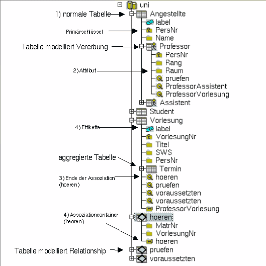 Hier handelt es sich um etwa die Modellierung von eingebetteten oder geschachtelten Tabellen. Sie werden naher von FormServer als eingebettete Formulare dargestellt. Man muss spezifizieren: die Behälter Tabelle, die Element Tabelle und Referenz, Fremdschlüssel in Elementtabelle, das auf Primärschlüssel in Container-Tabelle zeigt. Entsprechung in ER-Modell Abbildung 10 in Abschnitt namens Aggregation