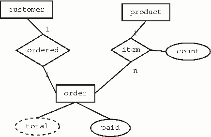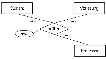 Die Abbildung 6 zeigt eine Assoziation zwischen Drei Objekten (Student, Vorlesung, Professor). Die entspreche Tabellen-Struktur ist wie folgt:Professor {PersNr,Rang,Raum}