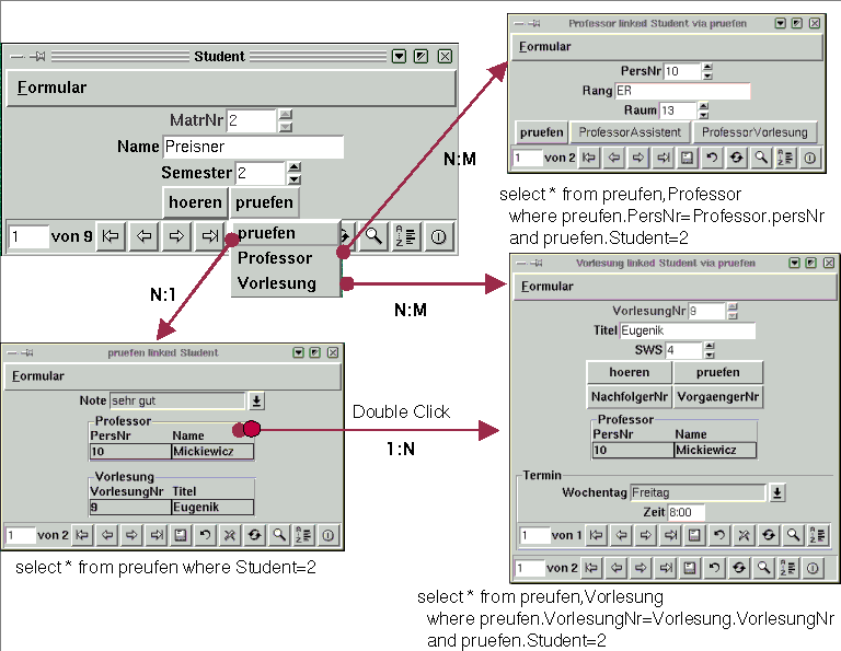 Das Konzept der Formular-Links kann auf dem ersten Moment sehr kompliziert erscheinen, ist allerdings intuitiv sehr schnell erlernbar und kann sogar durch die Möglichkeit von Links-Ketten sehr schnell zu Lösung von komplexen Fragen angewendet werden. Z.b. es kann schnell herausgefunden werden, mit welchen anderen Studenten ein Student einer Vorlesung zuhört. Die Fragestellungen. Wie heißen die Assistenten von Professoren, bei denen ein Student ein Prüfung ablegt, sind durch zwei Formular-Links zu lösen. Eine Frage, die bereits einer relativ komplexen SQL-Abfrage benötigt hätte.