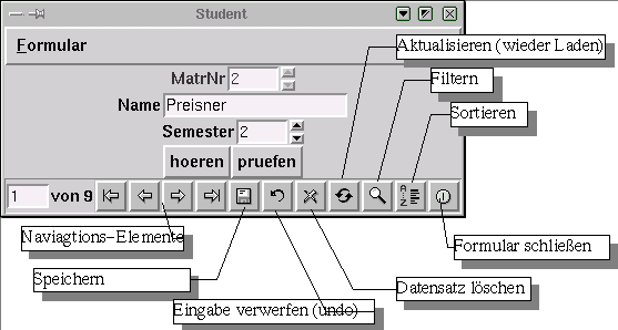 Es ist ein Programm, mit dem der eigentlicher Endbenutzer der Datenbank zu tun hat. Dieses Programm kann die Formularbeschreibungen, die von Formular-Editor stammen, richtig auswerten und die Formulare darstellen. Dieses Programm muss die Manipulationen auf den Formularen richtig in in die SQL Anweisungen umsetzten und an die Datenbank quittieren. Dabei werden folgende Funktionen unterstützt: