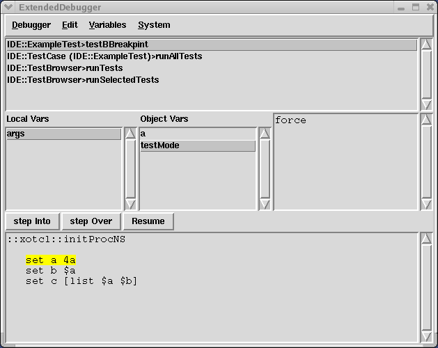 This debugger is based on atkdebugger Tcl extension. To use it you need this C-Extension that anyway need a patch for Tcl-Core. It this time this patch is only available for Tcl8.4.1 (works with 8.4.3 too). This debugger support really fast step into and step over commands and can show exactly the execution point in source code.