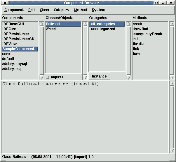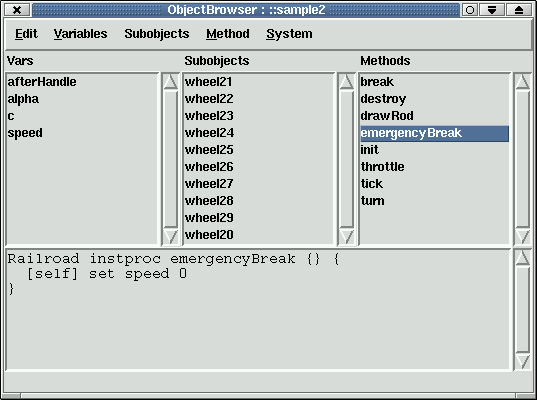 You can also invoke methods on an object directly in Object Inspector. Select emergencyBreak method and choose menu Method->Invoke. You can also specify which method you should see (only from Railroad or also inherited from Object or Superclasses). You can even see the method available per mixin on viewed object.[1] | Example by Richard Suchenwirth translated from Tcl to XOTcl by Gustaf Neumann and modified by me. Primary published on tclwiki. |