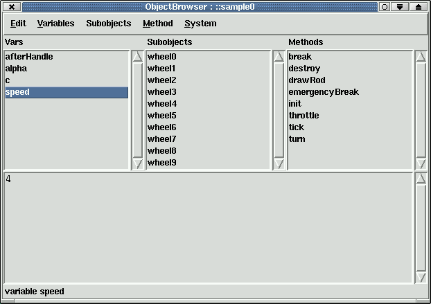 Additional XOTclIDE shows an another window called object inspector browser. This window shows the internal structure of XOTcl objects. You can see its variables (attributes), subobjects (aggregated objects) and methods.
